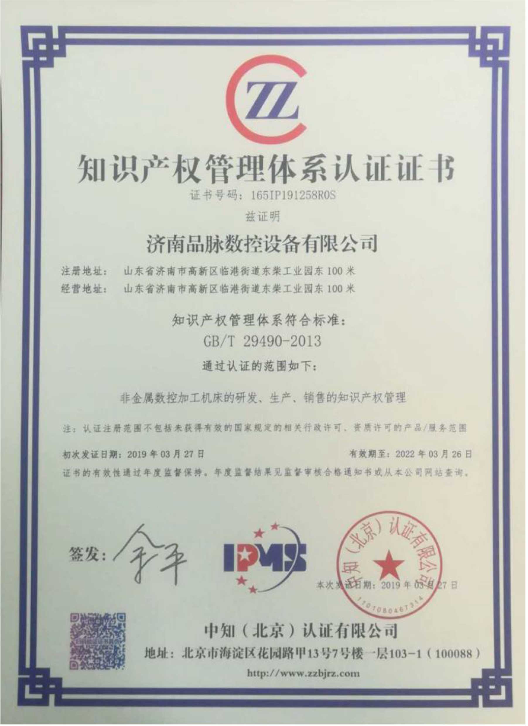 品脈數控榮獲知識產權管理體系認證證書